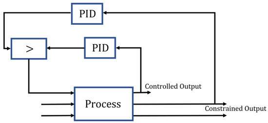 In an override control architecture, two or more CVs share a common actuator (MV). Depending on the current process state, a decision is made on which controller is in charge of the actual manipulation of the actuator; in other words, the various controllers can override each other [37]. Figure 2 reports an override control architecture. In the case reported in Figure 2, the decision is based on a comparison of the computed MV requests of both controllers; for example, the controller that demands the higher MV value takes control of the actuator (high-pass selector). Both controllers run the entire time. This scheme can also be used in applications with more than two CVs and with low-pass selector logic.
