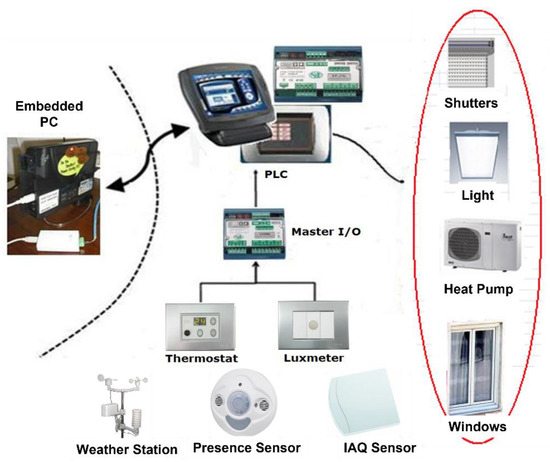 The processes which require significant energy consumption in buildings are heating, ventilating and air conditioning (HVAC), heating, ventilating, air conditioning and refrigeration (HVACR), and domestic hot water (DHW). The home and building automation (HBA) research area can cover these topics [12]. With regard to HVAC, four main factors have to be taken into account: thermal comfort, lighting comfort, a good level of indoor air quality (IAQ), and energy saving. In this context, comfort can be reached by maximizing the natural illuminance, maintaining a desirable indoor temperature, and ensuring IAQ. Conflicting objectives between comfort and energy saving must be handled [13]. In the last few years, many researchers, engineers, and practitioners have proposed monitoring, simulation, high-level optimization, and control solutions for HBA.