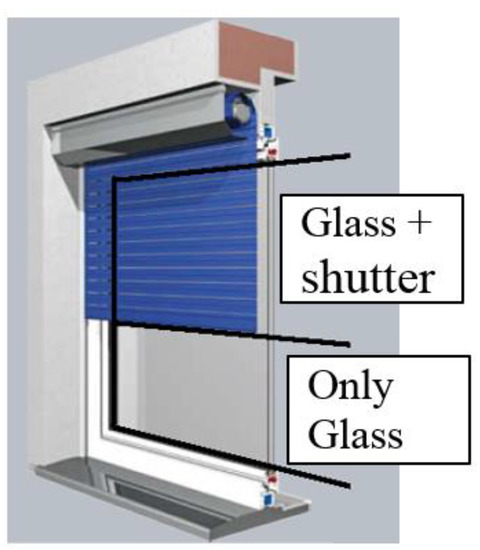 The window’s contribution to the room’s thermal behavior is characterized by conduction, convection and radiation phenomena. Equation (7) represents conduction and convection, while Equation (8) reports the radiation contribution. In Equations (7) and (8), two sections characterize the window’s contribution (see Figure 5): the first section is related to the lower part of the glass window and takes into account only the contribution of the glass (subscript gl), while the second section takes into account the contribution of the glass coupled to the rolling shutter (subscript gl_s). These contributions are modelized separately here and not reported for brevity. The density, the thickness, and the specific heat of glass and rolling shutters characterize these contributions [44].