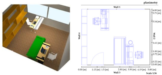 The room planimetry and top view are reported in Figure 6. In the planimetry of Figure 6, only the four vertical walls are reported; the other two horizontal ones (Wall-A and Wall-B in Table 3) are an attic floor and an intermediate floor; Table 3 reports the features of the walls. Walls 1–2 (Wall-SW and Wall-NW in Table 3) are external walls (see Figure 6). Their thickness, which is greater than the thickness of the other walls, is 420 [] and their intermediate layer is constituted by extruded expanded polystyrene. Their total thermal transmittance is 0.3 , i.e., they have a high opposition to thermal radiation. Windows are located on wall one. Walls 3–4 (Wall-SE and Wall-NE in Table 3) are characterized by a thickness equal to 300 [] (see Figure 6) and by a lower thermal resistance with respect to the exposed walls. The attic floor wall (Wall-A in Table 3) is similar to walls 1–2, while the intermediate floor wall (Wall-B in Table 3) is characterized by a thermal resistance lower than the attic floor wall [42].