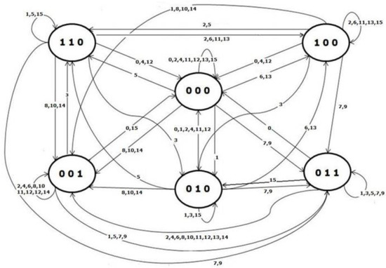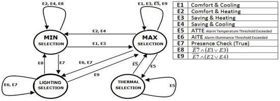 The architecture related to the initial control system is shown in Figure 8. A hybrid scheme consisting of PID controllers in a split-range configuration and a DEDS-based (automatic) supervision module performs the thermal control. A split-range configuration is used in order to split the thermal control efforts, considering the three available MVs (rolling shutters, heat pumps, and windows). MVs sequences are assigned based on the energy consumption profile, i.e., a higher priority is assigned to MVs with a lower energy effort (cost). For this reason, heat pumps haave the lowest priority. The DEDS-based (automatic) supervision module represents the splitter of the split range architecture. Based on the current process state, the automata take into consideration all process conditions, such as the malfunction of an actuator or unavailability of an actuator. Six states characterize the designed automata, together with events’ set of fifteen elements (see Figure 9 and Table 8). A state represents a defined operating mode. MVs’ availability differentiates each operating mode. Table 8 shows the operating modes of the split range configuration (“1” indicates that the considered actuator is available). The states associated with the simultaneous availability of the heat pump and of the windows were assumed to be inadmissible due to energy efficiency purposes. Furthermore, the rolling shutters can be used only if solar radiation is present. States transitions within the automata are triggered by events which are the result of the combination of the following parameters:
