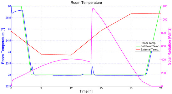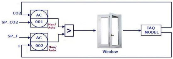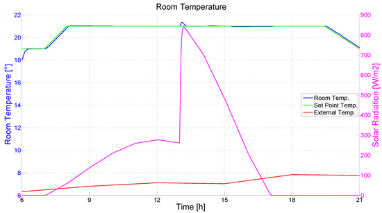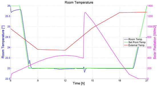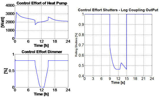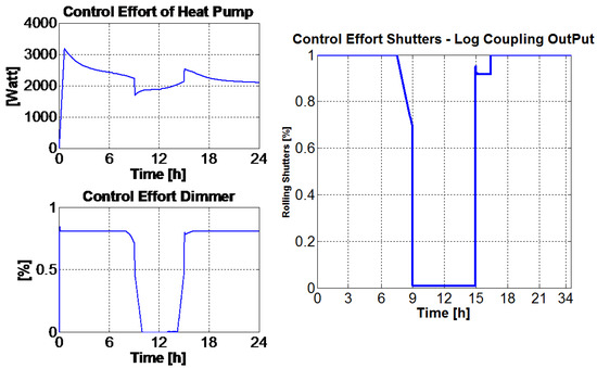 Based on the HVAC simulation framework described in Section 2.2, a HVAC control framework was designed and implemented. First, the MVs, the CVs, and the DVs were defined. The MVs group includes the heat supplied by the heat pump source, the shutter actuation factor of each of the two rolling shutters, the dimming of the artificial light, and the actuation of the natural ventilation through window opening. The CVs are the mean room temperature, the environment illuminance at the point of interest, and the IAQ parameters. The DVs are the outside temperature, the thermal radiation related to the window’s glass and to the walls, the natural illuminance, the heat supplied by the internal heat sources (people, lamps, and motors), and the wind speed.