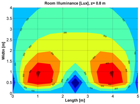 With regard to the lighting model, the artificial source is supposed to be located in the middle of the plane of the room (see Table 3), and it is considered a point of light source (see Section 2.2.2 and Figure 7). Furthermore, the artificial source is assumed to be capable of guaranteeing the same illuminance to both work positions (see Figure 6) [46,47]. The point of interest of the lighting model is assumed to be a single point of interest in the room, which was set at the coordinates (2.5, 2.0, 1.0) [], i.e., in the middle point of the room at a height of 1 [] above the floor. The choice of using illuminance at the midpoint of the room was mainly because, in most practical applications, only one luxmeter was available for each room [46,47].