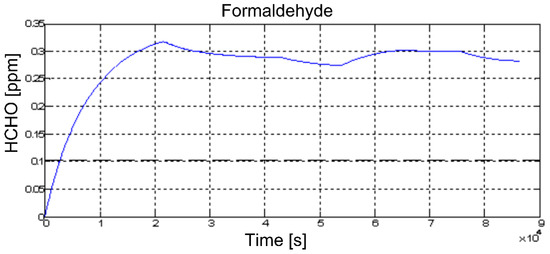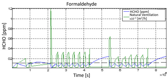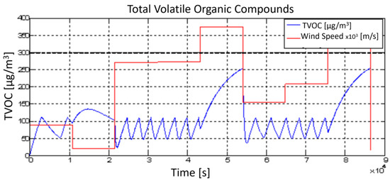 The IAQ model is composed of three main sources of pollution: formaldehyde (HCHO), carbon dioxide (CO2) and TVOC (total volatile organic compounds). The first one consists of a colorless organic compound with a highly irritating odor, used mainly in the production of wood panels and furniture, paints, and laminate. CO2 is produced by people in sedentary work in the room. The last source of pollution, i.e., TVOC, includes different chemical compounds. The concentration of toxic waste can be evaluated in terms of the volume of pollution to the volume of standard indoor air [48].