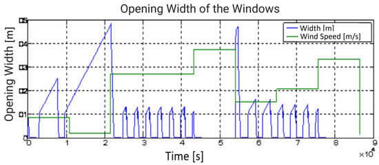 For the IAQ model (see Section 2.2.3), it is assumed that there are two desks composed of laminated panels and a bookcase in the office (see Figure 6). For a work desk height, a horizontal plane with an elevation equal to 0.8 [m] from the floor is assumed. The correspondent average HCHO emission value used in the equation is 3.5 [] and the furniture’s TVOC average emission per unit is used in the model is 0.125 []. Furthermore, CO2 average emission produced by two users in sedentary work is assumed to be 0.019 [52,53]. Finally, in order to enhance the fit of the framework for the real process, window opening is inhibited if wind speed is greater than a threshold value, i.e., 0.3 [m/s].