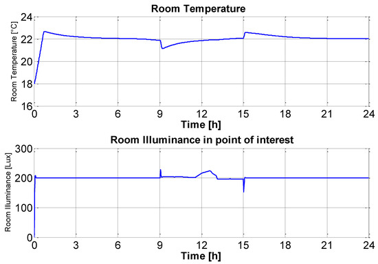 The formulated lighting model can be suitably extended to different room configurations and features and to multi-room environments. For example, if different points of interest were to be considered, an equation (similar to Equation (15)) for each point of interest must be formulated. Furthermore, if more artificial light sources are present, different artificial light source contributions (similar to the second and fourth terms of Equation (15)) must be included. In addition, if more windows are present, different natural light source contributions (similar to the first and third terms of Equation (15)) have to be considered.