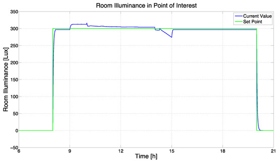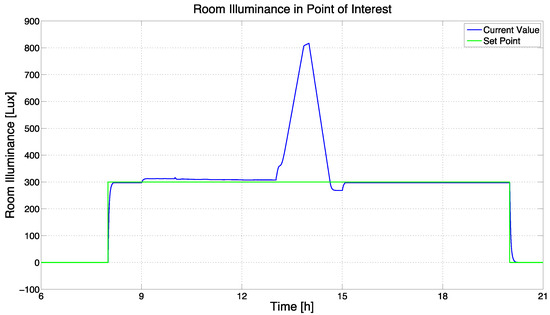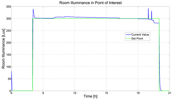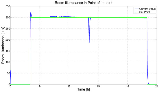 Control results (third scenario, modified control system, Energy Saving policy): room illuminance (CV).