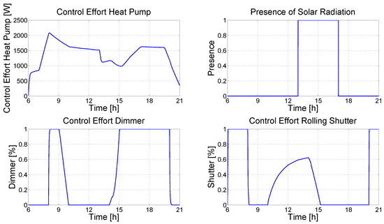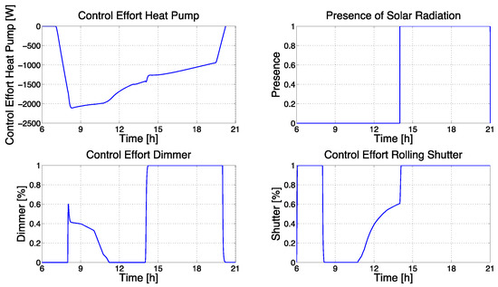 Control results (third scenario, modified control system, Comfort policy): MVs (heat pump, dimmer, and rolling shutters) and DV (presence of solar radiation).