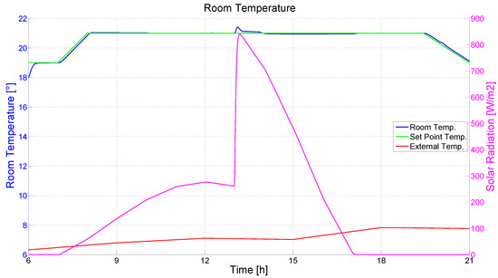 The thermal model of the considered office room takes into account the thermal behavior of the room, which can be modelized through an energy balance equation [42] reported in (5). Six main contributions were considered in Equation (5) for the total thermal accumulation, e.g., internal heat sources (, due to people, lamps, and motors), heat pump source (), thermal conduction and convection exchanges through walls , thermal conduction, convection and radiation exchanges through windows (, ), and finally the fluid dynamic exchanges with the outside environment (). The thermal contributions are reported in Equations (6)–(9), while the terms involved in the Equations (5)–(9) are reported in Table 4 [42].