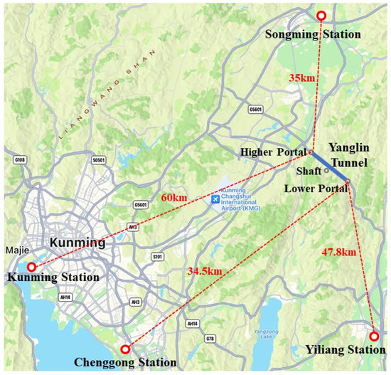 The existing natural wind calculation theory is based on the meteorological parameters of the tunnel portals. In order to achieve the purpose of feed-forward energy-saving ventilation in the tunnel, it is necessary to establish a set of natural wind prediction methods. Meteorological stations are installed at the lower portal, higher portal, and shaft of Yanglin Tunnel. However, due to the short construction and operation time of Yanglin Tunnel, the establishment time of meteorological stations lags the tunnel operation time, and the meteorological stations will face the risk of being damaged or dismantled in the future, resulting in a small number of samples of meteorological data at the tunnel portal at any moment, which cannot achieve effective prediction. Fortunately, there are four open-source ground observation stations of the China Meteorological Administration around the tunnel, with sufficient data samples which are easy to obtain. Among them, Songming Station and Kunming Station are in the north and southwest of the higher portal, about 35 km and 60 km away, respectively. Chenggong Station and Yiliang Station are in the south and southwest of the lower portal, about 34.5 km and 47.8 km away, respectively. The geographical relationship between the four national meteorological stations and the meteorological stations around the tunnel is shown in Figure 1.