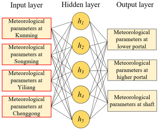 In order to support the prediction of meteorological parameters by using the data of the national meteorological station, it is necessary to determine the transmission relationship between each parameter and the meteorological stations. In this paper, multi-layer perceptron (MLP) is used to analyze the spatio-temporal characteristics of each piece of data to obtain the real-time meteorological parameters of the tunnel portal. MLP is a standard fully connected neural network model composed of multiple node layers, which is usually used to explore modeling, binary classification, multi-classification, and regression problems [21]. In this section, a multi-layer perceptron network containing three dense layers is established to realize the regression analysis of meteorological data at the tunnel portal. The prediction structure of the multi-layer perceptron is shown in Figure 3.