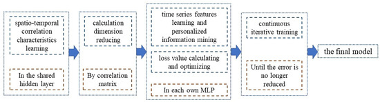 As shown in Figure 4, multiple tasks enter their own unique fully connected deep neural network, and each task uses its own MLP to learn its time series features and mines personalized information. Each task calculates the loss value according to the predicted value and the observed value and obtains the different losses of multiple tasks. Then, the multiple loss values are jointly optimized by weighted summation so that each task can better consider the results of their mutual influence in the learning process. In this process, the stochastic gradient descent algorithm is used for continuous iterative training to minimize the objective function. When the error of the verification set is no longer reduced, use the early stopping function to stop the training, and save the parameter decreasing to the lowest as the final model.