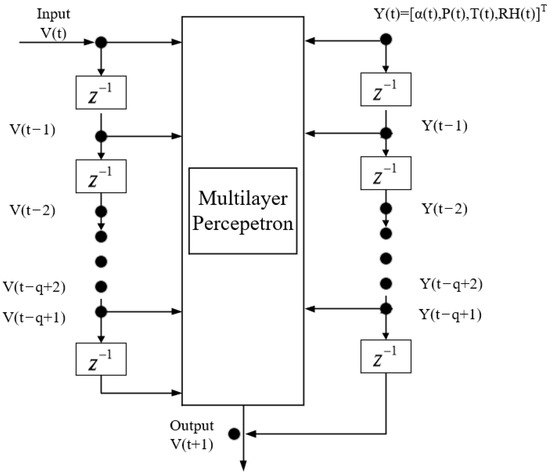 The NARX model (nonlinear autoregressive network model with exogenous inputs) is a dynamically driven RNN model which abandons the method of using static perceptron to build spatial models but simultaneously uses continuous exogenous inputs combined with autoregressive algorithms for prediction [22]. Taking the wind speed prediction as an example, as shown in Figure 5, there are five input variables, namely, (wind speed), (wind direction), (air temperature), (barometric pressure), and (relative humidity). The model is a two-layer feedforward network, with a tan-sigmoid transfer function in the hidden layer and a linear transfer function in the output layer. The model relates the current value of a time series to both the past values of the same series and the current and past values of the driving (exogenous) series. The network is created and trained in an open loop using a real output, which is more accurate and efficient than closed-loop systems. Once trained, the network can be converted to a closed-loop prediction mode. This process adopts the static backpropagation algorithm and decoupling feedback [20]. Relevant studies showed that when NARX models are used for prediction calculation, the method of delaying practical prediction has a good effect, and it is not easy to overfit [23,24]. This method will be used to predict the meteorological parameters in the next period of the tunnel portal.