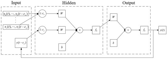 The grid architecture of the NARX network is shown in Figure 6. The symbolic meaning is the same as that in Equation (2). There are five input delay terms in the input layer, corresponding to five meteorological parameters, and each input delay term contains orders. is the output delay term generated after training and also becomes the input value of the next time period prediction so that the model can realize the delay and feedback functions.