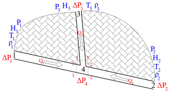 where is the ultrastatic pressure of node i (i ranges from 1 to 3), (i ranges from 1 to 4; the same below) is the friction drag coefficient of node i, is the local drag coefficient of node i, is the air flow of node i, is the resistance coefficient of point i, is the tunnel section perimeter of node i, and is the section area of node i.