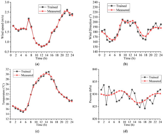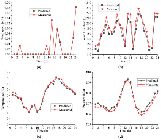 After all the training data are trained using the method in Section 2.3, the model is converted into a closed-loop mode to provide the prediction of the next set of values generated based on the input of the training data. Taking the meteorological parameters at the lower portal on 1 October 2021 as an example, the comparison between the trained results and the measured results at the meteorological station is shown in Figure 9.