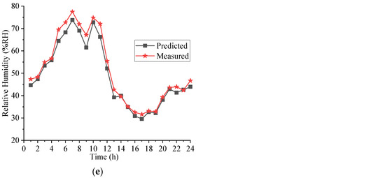 Curves of the predicted and measured data. (a) Wind speed. (b) Wind direction. (c) Temperature. (d) Barometric pressure. (e) Relative humidity.