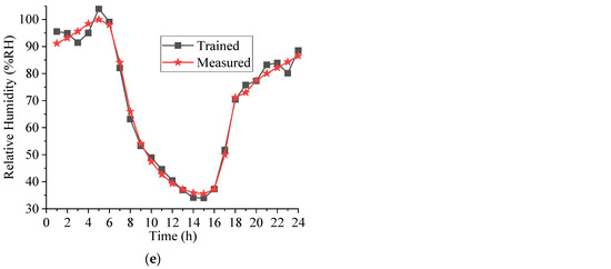 Comparison between the trained and measured results. (a) Wind speed. (b) Wind direction. (c) Temperature. (d) Barometric pressure. (e) Relative humidity.