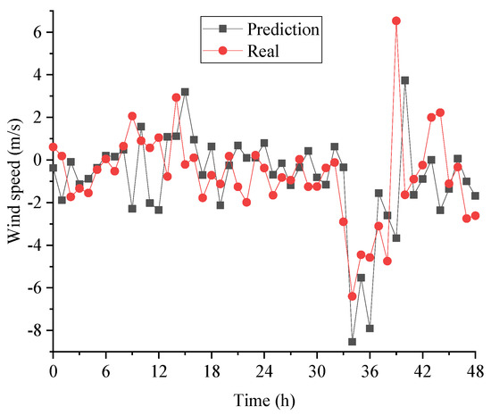 Many scholars have formed a set of effective methods to calculate the natural wind in tunnels. Their work mainly started with the improvement of calculation parameters and methods, focusing on how to calculate the natural wind speed through meteorological parameters more accurately [9,12,14] and lacking research on natural wind prediction. However, the ultimate purpose of using tunnel natural wind is to adjust the output power of the tunnel fan according to the natural wind speed. If the speed and direction of the tunnel natural wind can be calculated based on short-term prediction, the power of the tunnel fan can be prepensely controlled. As shown in Figure 10, the final predicted natural wind speed in the tunnel also shares the same trend as the measured value. It can be seen that, due to the steps of prediction and theoretical calculation, the final predicted natural wind curve deviates more from the measured value curve, which also leads to a smaller correlation coefficient R. However, this is still within the acceptable range. According to Table 8, the RMSE and MSE of the ultimate tunnel natural wind results are controlled in 0.45 and 0.9, respectively, which confirmed the feasibility of the prediction method.