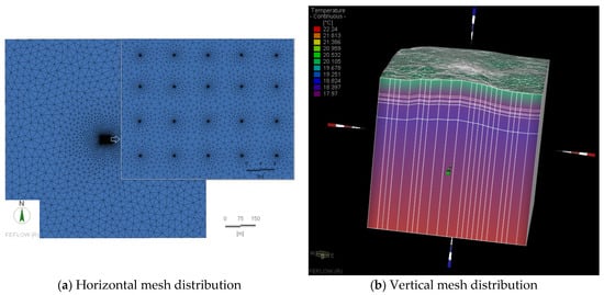 Horizontally, each layer of the study area is separated into 11,007 elements and 5546 nodes, in which the group of BHEs (consisting of 20 heat exchangers, with a hole spacing of 8 m) is locally grid-encrypted. Vertically, the study area is divided into 77,049 elements and 44,368 nodes based on the lithology and thickness of the above-mentioned strata with an unequal interval division (see Figure 2).