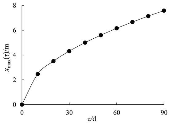 From the thermal properties test, the value of a for layer 6 is 4.31 × 10−7 m2/s, i.e., 0.0372 m2/d, and from the above, v = 0.003 m/d; then, the variation curve of xmax(τ)–τ can be plotted according to Equation (6) (see Figure 3).