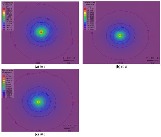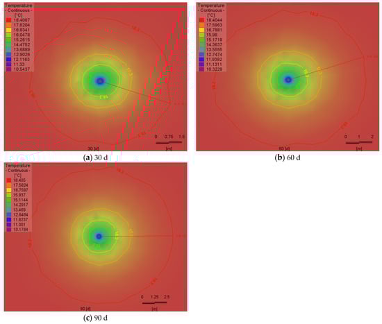 According to the measurement results of the temperature sensor buried in the observation hole, the initial ground temperature of Slice 7 is 18.40 °C. From Figure 4, it can be seen the area outside the 18.5 °C isotherm is less affected by the BHE, and the temperature variation is less than 1% of the initial ground temperature of Slice 7; thus, the maximum linear distance from the center of the BHE to the 18.5 °C isotherm is taken as the influence radius of the single BHE, while, for Figure 6, similarly, the maximum linear distance from the center of the BHE to the 18.3 °C isotherm is taken as the influence radius. Then, the influence radius after 30 d, 60 d, and 90 d of refrigeration is 4.61 m, 6.33 m, and 7.68 m, respectively, and that of heating is 4.31 m, 6.01 m, and 7.52 m, respectively.
