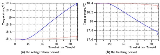 Figure 6 shows that the temperature at observation point 1 (x = 4 m) fluctuates slightly within the first 15 days and then increases or decreases approximately linearly, while that at observation point 2 (x = 8 m), it remains basically constant within 50 days, followed by minor variations. Additionally, it can be seen from Figure 6 that the temperature variation during the refrigeration and heating periods at observation point 1 ranges from 0.6 to 1 °C, while that of observation point 2 is less than 5‰ of the initial temperature. Therefore, it is reasonable to set the hole spacing of the GCHP project to 8 m, which can effectively reduce the thermal interference between BHEs.