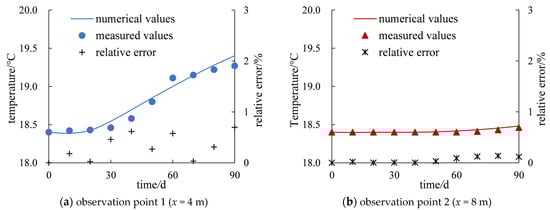 From Figure 7, it can be seen that the temporal variation process of temperature indicated by the numerical simulation and the measured data are essentially consistent, with relative errors of less than 1%.