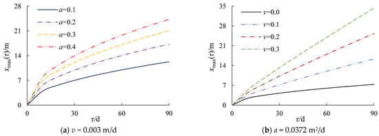The curves of xmax(τ)–τ for different values of a when v = 0.003 m/d and those for different values of v when a = 0.0372 m2/d are illustrated in Figure 8.