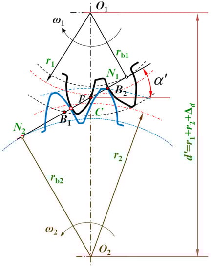 where, and are the pressure angle at addendum circle of the pinion and gear, respectively. When the center distance of the gear pair increases, the contact ratio can be obtained by