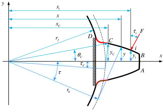 Figure 2 shows the geometrical profile and force diagram of the involute spur gear. AB is the addendum circle. Curve BC is the involute, and Curve CD is the transition curve at tooth root. rf represents the radius of the dedendum circle, and point i refers to the point at which the load is applied; F is the applied load; x and y represent the x-value and y-value of the point of tooth profile, respectively. τ is the angle between x-axis and the line between the rotational center and the tangent point in base circle. ϑ is the angle between x-axis and the line between the rotational center and point C. We can use the potential energy method to calculate the time-varying meshing stiffness (TVMS). The tooth can be equivalent to the cantilever beam consolidated in the tooth root circle [34]. When the teeth loaded a force of F, it will produce contact deformation, bending deformation, shear deformation and compression deformation. In addition, the gear body will also contribute to the tooth deflections [35].