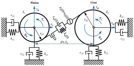 The gear contact model can be equivalent to the contact between two base cylinders connected by a spring-damping system. The nonlinear dynamic model with six DOF is illustrated in Figure 3. Therefore, the generalized coordinate vector of this system is . Where, xi, yi and ϑi are the displacement in the direction x, y and rotation; kxi and kyi are the bearing stiffness along the direction x and y, respectively; cxi and cyi are the bearing damping along the direction x and y, respectively; Ji is the moment of inertia, and Ti is the torque. rbi is the radius of the base circle, and b represents the half of the backlash. km and cm are the TVMS and the mesh damping, respectively. d is the center distance of the gear pair, and e is the transmission error, respectively. DTE of gear drives reflects the ability of gear to resist deformation along LOA direction. DTE is an important parameters to evaluate the vibration performance of gear drives, and it can be defined as: