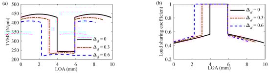 Due to the existence of the clearance in the revolute pair, there are various changes in the meshing angle and the contact ration of the gear pair, which has a considerable effect on the TVMS of the gear pair, as shown in Figure 4a. The length of the LOA of the gear pair decreases with the increase of the clearance in the revolute pair, thereby greatly reducing the contact ratio of the gear pair. When the clearance in the revolute pair becomes large, the TVMS of the gear pair decreases in the single teeth contact area and double tooth contact area. The RMS value of the TVMS in a mesh cycle decreased from 399.4 N/μm to 384.5 N/μm.