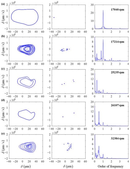 The orbit, Poincaré and FFT plots at different speeds (a–e).