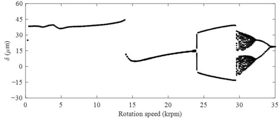 In the acceleration process, the bifurcation behavior of a gear transmission system with the clearance of 0.3 mm is illustrated in Figure 7. Comparing the bifurcation behavior of a gear transmission system without the clearance, the chaotic motion within the speed of 17,214–18,435 rpm disappears in the gear transmission system with the clearance of 0.3 mm. In gear drives, nonlinear dynamic behaviors are caused by the backlash and nonlinear mesh stiffness. When there is a clearance of 0.3 mm in the gear system, the change of backlash and mesh stiffness caused by revolute pair clearance induces the chaotic motion to disappear. As a result, the system with the clearance of 0.3 mm remains the T-period motion from 300 rpm to 23,849 rpm. Due to the existence of the clearance, the pinion speed at which the T-period motion transforms to the quasi-period motion is delayed from 22,445 rpm to 24,015 rpm. Then, the quasi-period motion directly transforms to a 2 T-period motion instead of the 4 T-period motion. However, the chaotic motion at the high-speed of the gear transmission system with a clearance of 0.3 mm is advanced to 29,594 rpm, and then bifurcates again into a 2 T-period motion at 32,384 rpm. The system remains the 2 T-period motion until it transforms to a T-period motion at 34,477 rpm.