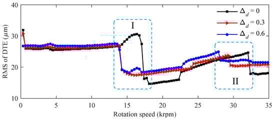 RMS of the DTE of the gear pair with different clearances is predicted in acceleration process, as shown in Figure 9. With the increase in the clearance of the revolute pair, the RMS of the DTE becomes large, especially in the middle and high speed area. The RMS of the DTE drops suddenly in regions I and II, and the clearance in the revolute pair causes the sudden drop phenomenon in advance. This is because the clearance in revolute pair causes the speed corresponding to the nonlinear behavior to change.