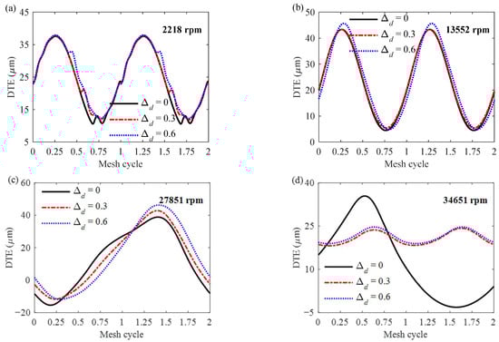 The DTE of the gear pair at different speeds in time domain (a–d).
