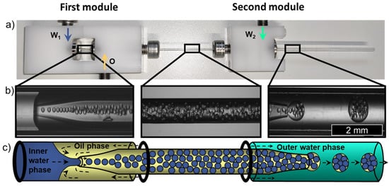 (a) Photography of the used combination of two microfluidic break up points. In the first module the inner emulsion is produced, in the second module is the double emulsion. (b) Microscopic images of the break-up points and the transport capillary between the devices. (c) A schematic drawing of the process. Reprinted from Leister et al. [] with permission from Elsevier.