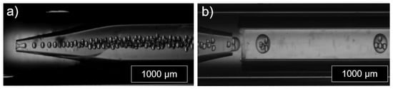 The capillary tips were made from 1.0/0.58 mm OD/ID capillaries (World Precision Instruments, Friedberg, Germany) with a micropipette puller (P-1000, Sutter Instruments, Novato, California). The orifice size was achieved by polishing the pulled capillaries to the desired sizes. The tips were treated with silanes supplied by Gelest Inc. (Morrisville, Pennsylvania): 2-[methoxy(polyethyleneoxy)6-9-propyl]tris(dimethylamino)silane was used for hydrophobic treatment at the first break-up and n-octadecyltrimethoxysilane was used for hydrophilic treatment for the second break-up. The positioning of the capillaries in the chip and the tubing of the fluids to the chip were made with so called LEGO-devices, as published by Bandulasena et al. [].