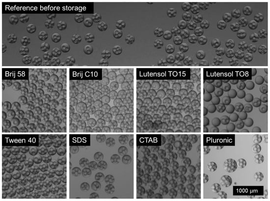 In Figure 3, examples for the different coalescence mechanisms can be seen. A detailed comparison of the stability of the formulations will follow in Section 3.3 and Section 3.4. The sample with Brij 58, Lutensol TO15, Tween 40 and SDS showed no coalescence within the first 20 min of storage time. It is noticeable that the oil droplets stabilized with SDS are way less densely packed than the other droplets. This can either be explained by different forces between the droplets, or, more likely, by the interaction of the droplet interfaces with the glass slide. For some surfactants, the droplets seem to be attached to the glass surface and do not move. For other surfactants, the droplets slid along the glass until they got into contact. The samples without any hydrophilic surfactant and the droplets stabilized with Pluronic also did not touch each other on the microscope slide. Whether the droplet got in contact or not, no coalescence event was observed on the microscope slide, even if the samples were left there for one hour.