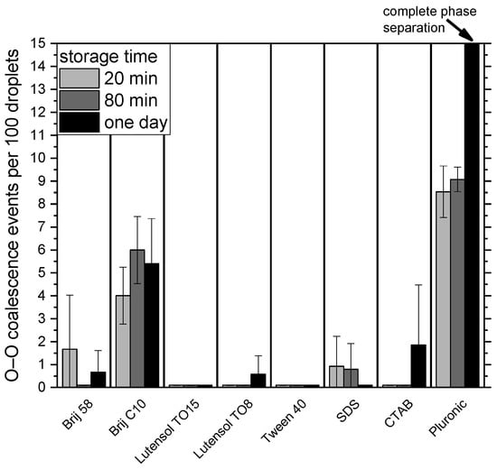 In Figure 6, W1–W1 coalescence is depicted. All W1 droplets were stabilized with PGPR from the beginning. The hydrophilic surfactant was later added to the W2 phase. In general, it is considered that the hydrophilic surfactants cannot directly adsorb at the W1/O interface and change the stability of W1 droplets. However, hydrophilic surfactants are reported to diffuse through the oil phase to the W1/O interface over time and destabilize it []. Again, the value for no coalescence event is set to 0.1 for illustration. Lutensol TO15 samples showed nearly no W1–W1 coalescence at all. Additionally, SDS did not interfere significantly in W1–W1 droplet stability within the first day of storage. For the samples stabilized with Brij 58, Tween 40 and Pluronic, some of the inner droplets coalesced. Brij C10 and CTAB samples were the most instable for this coalescence mechanism. For Lutensol TO8, no inner droplets of increased size were observed, for the reason that all inner droplets were released rapidly. It is interesting that the same surfactants that triggered W1–W2 coalescence also showed W1–W1 coalescence (Brij C10 and CTAB). It can be expected that for double emulsions stabilized with Lutensol TO8, W1–W1 coalescence also occurs and is just not observed here due to the fast release. Therefore, the hypothesis can be postulated that the stability against coalescence of two water phases in double emulsions is similar whether it concerns W1–W1 coalescence or W1–W2 coalescence.