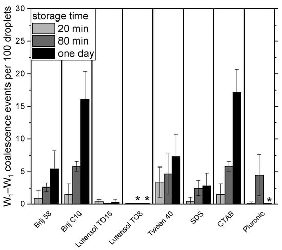 Number of W1–W1 coalescence events normalized to 100 droplets for 0.9 wt% of different hydrophilic surfactants in W2 and 1 wt% of PGPR in O. Apart from the Lutensol TO15 types, all double emulsions had coalesced inner droplets. The bars marked with an asterisk could not be measured due to major instabilities because of O–O and W1–W2 coalescence.