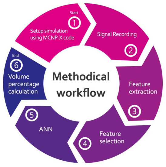 Among the topics that have led to many studies by researchers, determining the volume percentage of flows that pass-through oil and gas transmission lines have attracted enormous interest. Photon attenuation techniques, capacitive tomography, resistance tomography, X-rays, and so on are a few of the various noninvasive methods that may be used to assess these characteristics. Recent years have seen many studies utilizing the photon attenuation approach to identify these factors [1,2,3,4,5,6,7,8,9,10,11,12,13,14]. Using the MCNP algorithm, the authors of reference [1] analyzed three distinct flow regimes: stratified, homogeneous, and annular, in varying volume fractions. The researchers employed two radioisotope sources and three NaI detectors in the investigation to calculate volume fractions and classify flow regimes. To determine the different flow regimes, a neural network was developed. Three different networks were developed to calculate the volume fractions of oil–water–gas three-phase flow. Another research recommended a different methodology for calculating volume fractions inside a hierarchical framework. A NaI detector located adjacent to a cesium-137 source recorded the spectrum of energy emitted by the backscattered gamma rays in this setup. In [2], an MLP neural network was utilized to accurately estimate volume fractions with an error of 6.47 percent. Feature extraction from detected signals has been the focus of many studies in recent years. Researchers such as Sattari et al. [3] have conducted extensive studies to incorporate the most useful features in the temporal domain. An experimental setup including a cesium-137 source, two NaI detectors, and a Pyrex glass was used to determine flow type and volume fractions. After data collection, time-domain characteristics were extracted to aid in data interpretation. An MLP neural network was then used to identify the flow regime type and estimate volume percentages accurately. A single detector was utilized to calculate volume fractions and classify flow regimes in the study [4], which relied on time-domain characteristics and a GMDH neural network. Roshani et al. used the dual-energy approach to investigate three-phase flows. They used 241Am and 137Cs sources with NaI detectors for their detection system and trained the neural network using data from two detectors that captured counts of 241Am and 137Cs and were able to estimate volume percentages with an MRE% of less than 5.68 [5]. Several characteristics in the time [6] and frequency [7] domains were presented by Hanus et al. to identify the kind of flow regimes in two-phase flows, and the most useful features for doing so were then determined. Subsequent studies attempted to identify the flow regimes represented by these features and other neural networks [8]. Hosseini et al. used the fast Fourier transform (FFT) to transform signals from the time domain to the frequency domain, from which time domain features were retrieved. This set of features allowed them to recognize all flow regimes and forecast volume percentages in two-phase flows with pleasant accuracy [9]. X-ray tubes have several benefits, including being portable, easy to move about, emitting high-intensity radiation, having an on/off switch (crucial for the safety of the persons using the machines), and consistently emitting radiation. Because of the mentioned advantages, X-ray tubes are now often used in place of radioisotopes [15,16,17,18]. X-ray densitometry was presented in [15], where two-phase flow characteristics were measured with an X-ray tube and multiple detectors. The study utilized one X-ray tube and one NaI detector [16], and the stratified and annular flows were modeled. The accuracy of the suggested technique demonstrated the feasibility of using X-ray tubes and ANN to identify multiphase flow parameters. Volume percentages and types of flow regimes in three-phase flows could be measured using the structure presented in the research [17], which consists of an X-ray tube and two detectors. Both detectors recorded photon energy spectra that were analyzed as the GMDH neural network’s inputs for calculating the above parameters. Except for one instance, the flow regime was accurately identified, and predictions for volume percentages had a root-mean-square error (RMSE) of less than 3.1. Three-phase flow volume fractions could be calculated using the approach provided in reference [18], which involves modeling two flow regimes, stratified and annular, at varying volume fractions. An X-ray tube and a sodium iodide detector form the basis of the design under consideration. The used neural network was GMDH type, and its prediction error was less than 6.69%. This study employs X-ray tubes, two NaI detectors, frequency-domain, wavelet features extraction techniques, PSO-based feature selection, and a multilayer perceptron (MLP) neural network to improve the precision of measuring volume fractions in oil–water–gas three-phase flows. The proposed manner can be seen in Figure 1. The following is a summary of recent research’s major contributions: