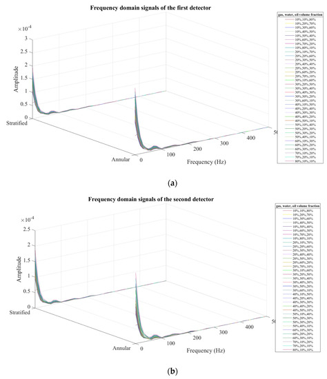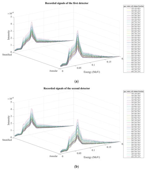 The signals recorded by the (a) first and (b) second detectors correspond to simulated flow regimes in different volume percentages.