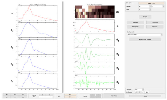 In addition, a second high-pass filter (h) works in tandem to further break down the signal. Figure 6 provides a detailed depiction of a signal’s degeneration. The approach yields both details coefficients (as would be the case with a high-pass filter) and approximations (as would be the case with a low-pass filter). At the conclusion of the filter is a two-stage downsampler. The downsampled output of the low-pass filter provides approximation (a), while the high-pass filter’s low-pass samplers give detail (d). At each successive level, the approximation component may be broken down further into its constituent parts. At this time, the analysis in this research has progressed into the fourth stage. For a given mother wavelet (t), the wavelet operation selects a unique set of child wavelet coefficients. The mother wavelet is scaled and shifted by powers of two in the discrete wavelet transform [21,22]: