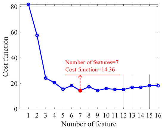 The value of the cost function is calculated by the PSO algorithm in terms of the number of features.