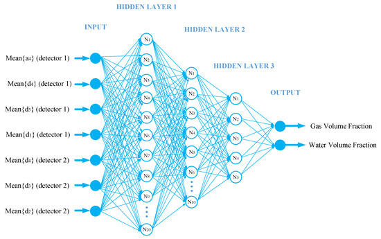The implemented neural network structure to determine the volumetric percentages of gas and water.