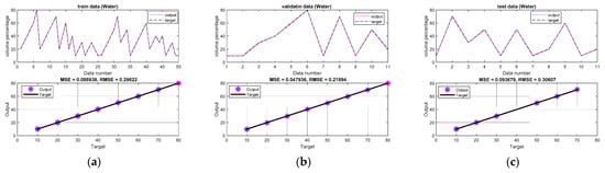 Regression diagram related to the prediction of water volume percentage for (a) training, (b) validation, and (c) test data.
