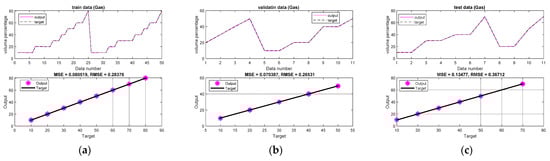 Regression diagram related to the prediction of gas volume percentage for (a) training, (b) validation, and (c) test data.