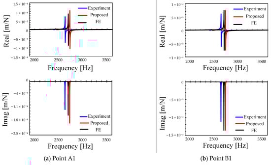 For comparison purposes, the FRFs were also calculated using the finite element (FE) model developed by commercial software Abaqus 6.14 (Dassault Systèmes, Inc., Paris, France) and an eight-node solid brick element was employed to develop the FE model. The exciting force was set to a value of 1 N, and clamping boundary conditions were applied on the base of the benchmark. The element size was assigned as 1 mm. From an investigation of the element size on the FRF prediction results, little influence was found when using even finer elements. The parameters used to predict FRFs, containing material properties, dimensions, boundary conditions, and proportional damping constants, were substituted into the dynamics model. The FRFs were predicted using two methods and the four points A1, B1, C1, and D1 were selected for comparison. Figure 11 shows the experimental and predicted results of the FRF. The comparisons of natural frequency between the dynamics models and the experimental measurements are illustrated in Table 1. The proposed model can reach a similar accuracy to the typical FE model.